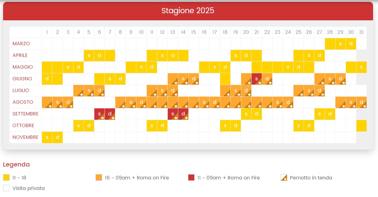 Apertura serale con spettacolo Roma on Fine dal 13 giugno al 14 settembre.